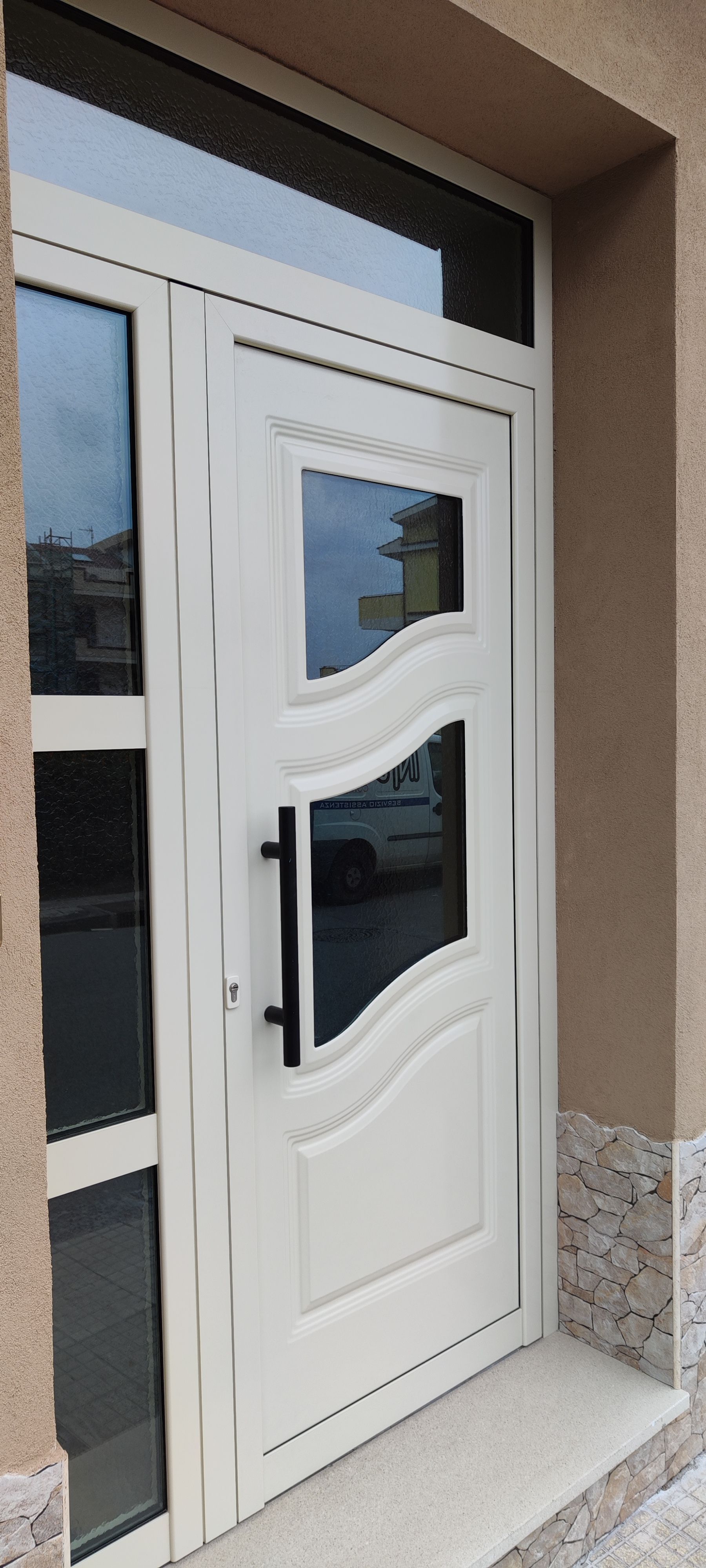 PORTONI BLINDATI: Il rivestimento esterno è a scelta tra una svariata gamma di pannelli in legno della linea masselli, pantografati o anche in alluminio da 7mm in MDF, o in renolit "ALUFORM - BUGNALL -SOLARIA", il pannello interno si puo' realizzare con pannello in legno della stessa tinta delle porte interne o anche con pannelli colorati.